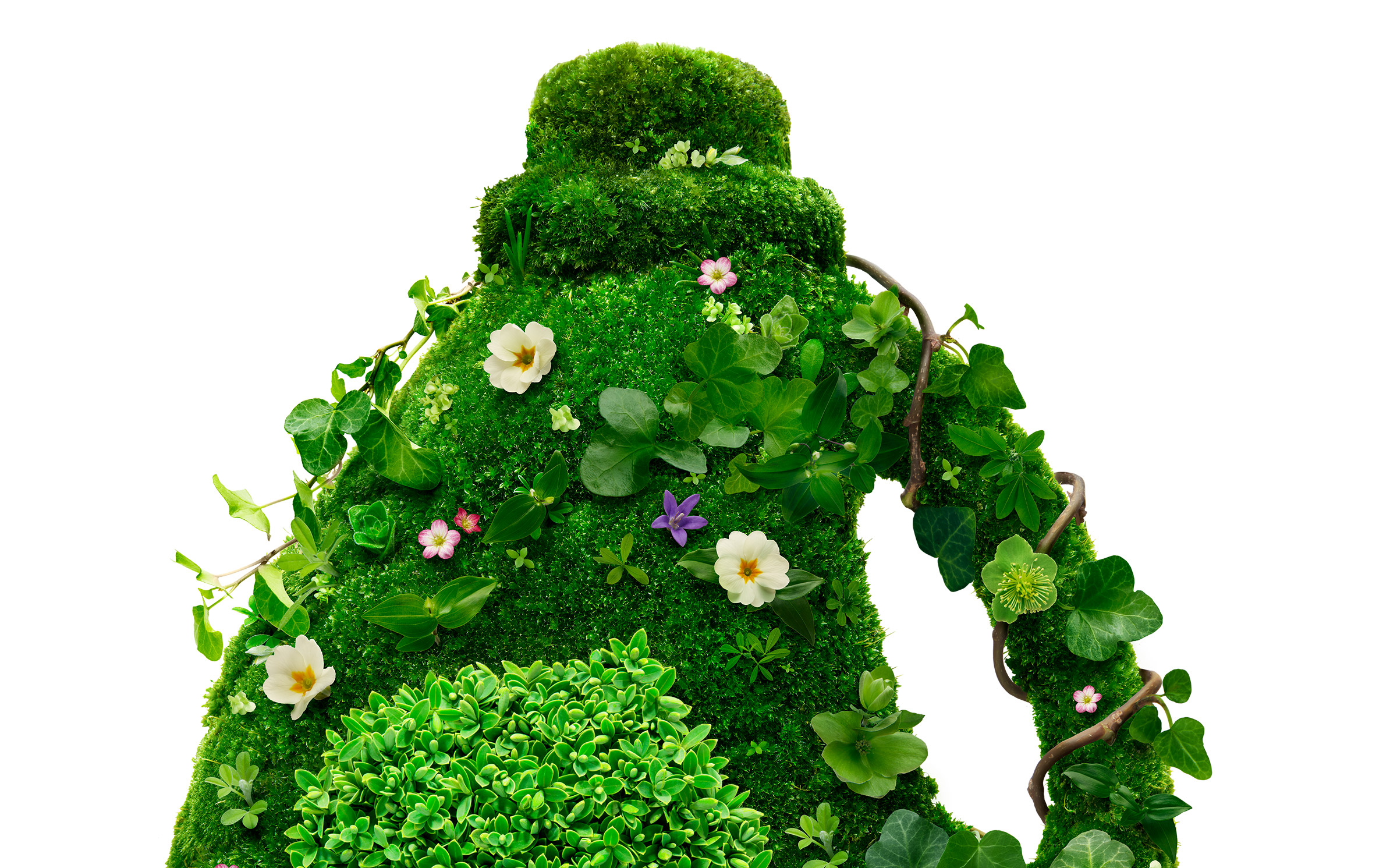 We created these laundry bottles using lush, pristine moss that we cultivated with love in our studio, from small grafts collected outdoor, styled to embrace the shape of the original bottles. We decorated them with fresh little beautiful meadowy flowers, foliage elements & wild ivy trails.